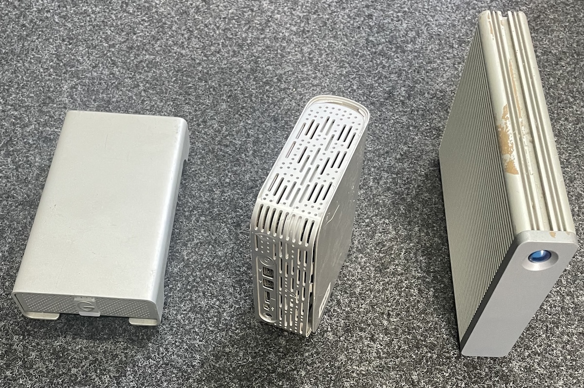 We recently received three failed vintage storage devices from a very unfortunate customer. They consisted of an external Lacie Big Disk containing two hard drives. An external WD MyBook and an external G-Drive both containing single hard drives. All three had old style Firewire & eSata type interfaces.